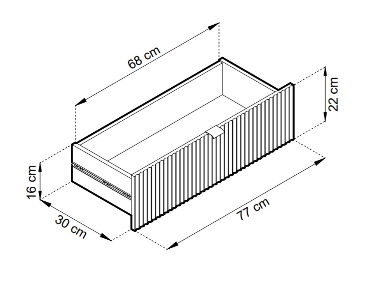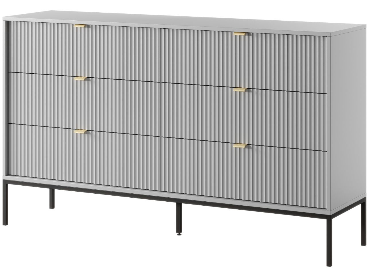 Cechą charakterystyczną komody są subtelnie ryflowane fronty, które w połączeniu z minimalistycznymi uchwytami podkreślają jej elegancki charakter. Wnętrze skrywa sześć pojemnych szuflad, które pomogą utrzymać porządek i zorganizować przechowywanie – od ubrań po akcesoria codziennego użytku. Z kolei szeroki blat stanowi doskonałe miejsce na dekoracje, takie jak kwiaty, świece czy fotografie.