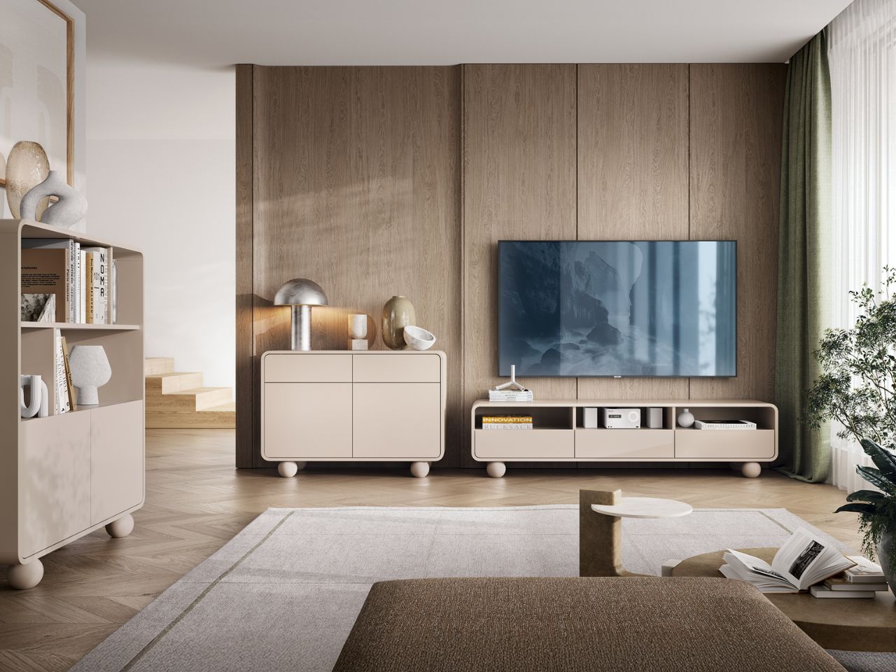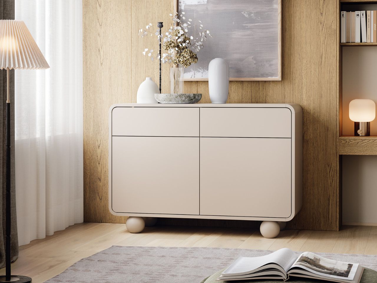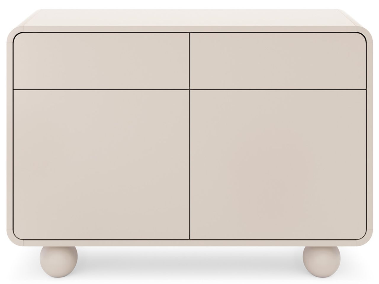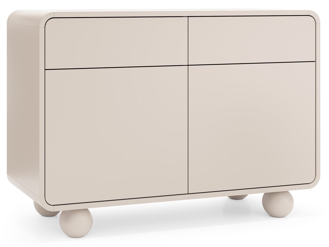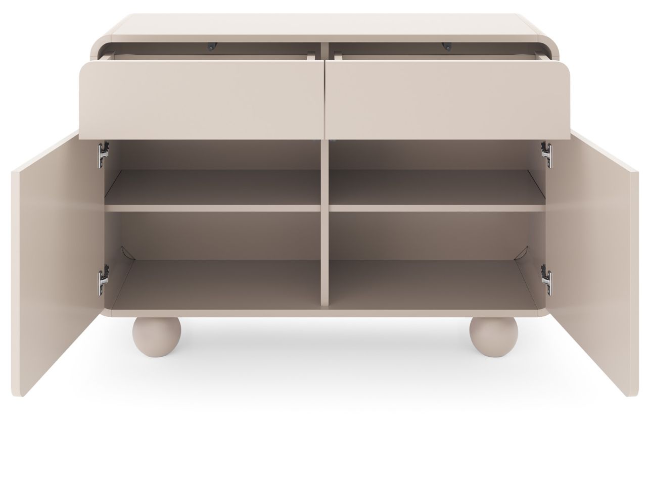 Mebel wykonano w eleganckim kolorze kaszmiru, który nadaje wnętrzu ciepła i harmonii. Minimalistyczna forma komody została uzupełniona delikatnie zaokrąglonymi krawędziami, co dodaje jej subtelności i nowoczesnego charakteru. Designerskie nóżki w kształcie kul nie tylko podkreślają lekkość konstrukcji, ale również ułatwiają sprzątanie pod meblem.