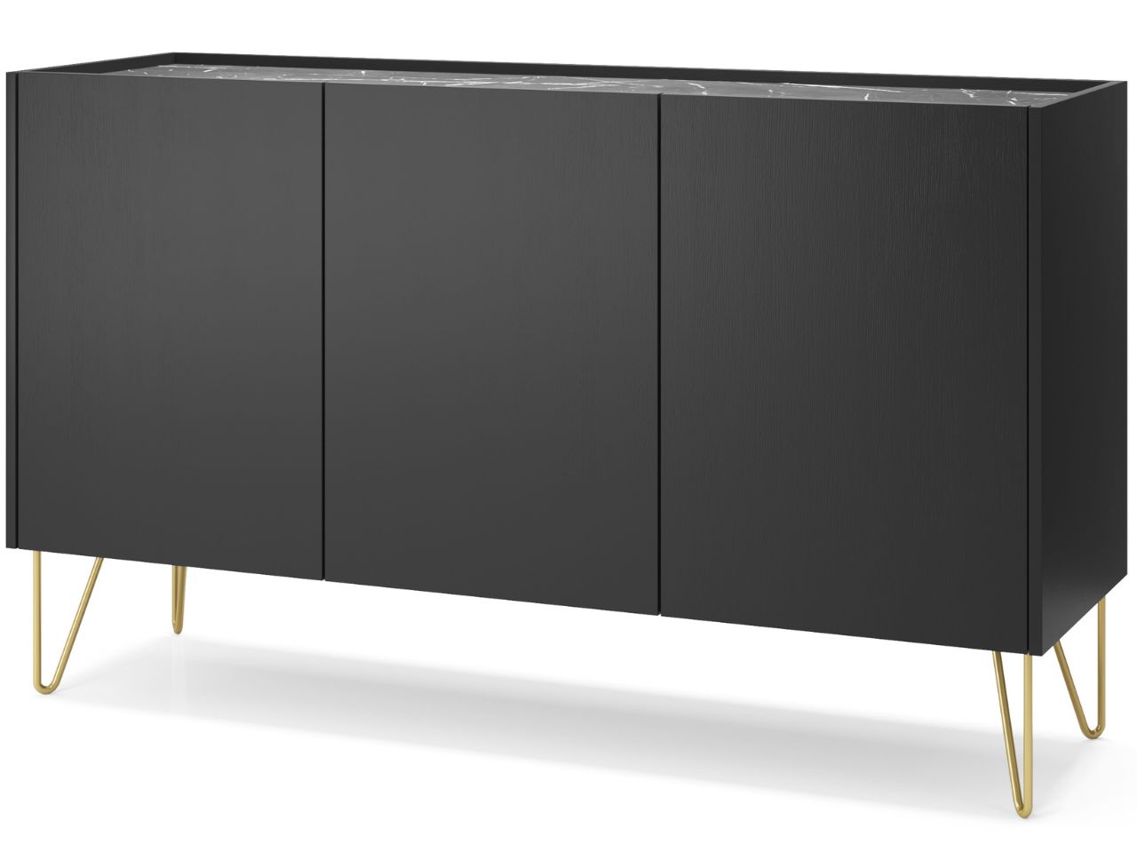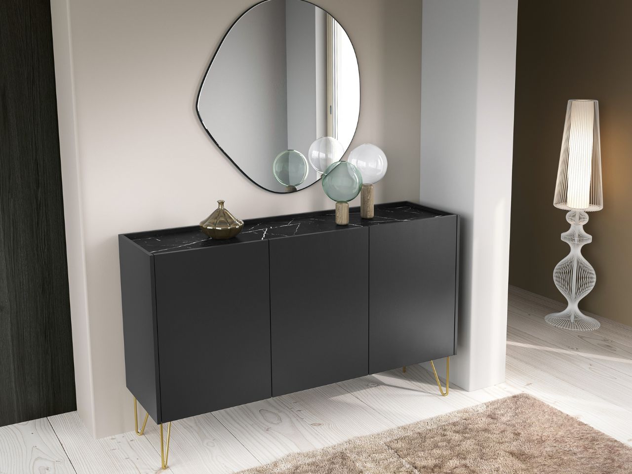 Komoda Darky to stylowy i funkcjonalny mebel, który doskonale wpasuje się w nowoczesne wnętrza. Jej elegancka, czarna kolorystyka w połączeniu z blatem w efektownej imitacji czarnego marmuru z białym użyleniem nadaje jej wyjątkowego charakteru.