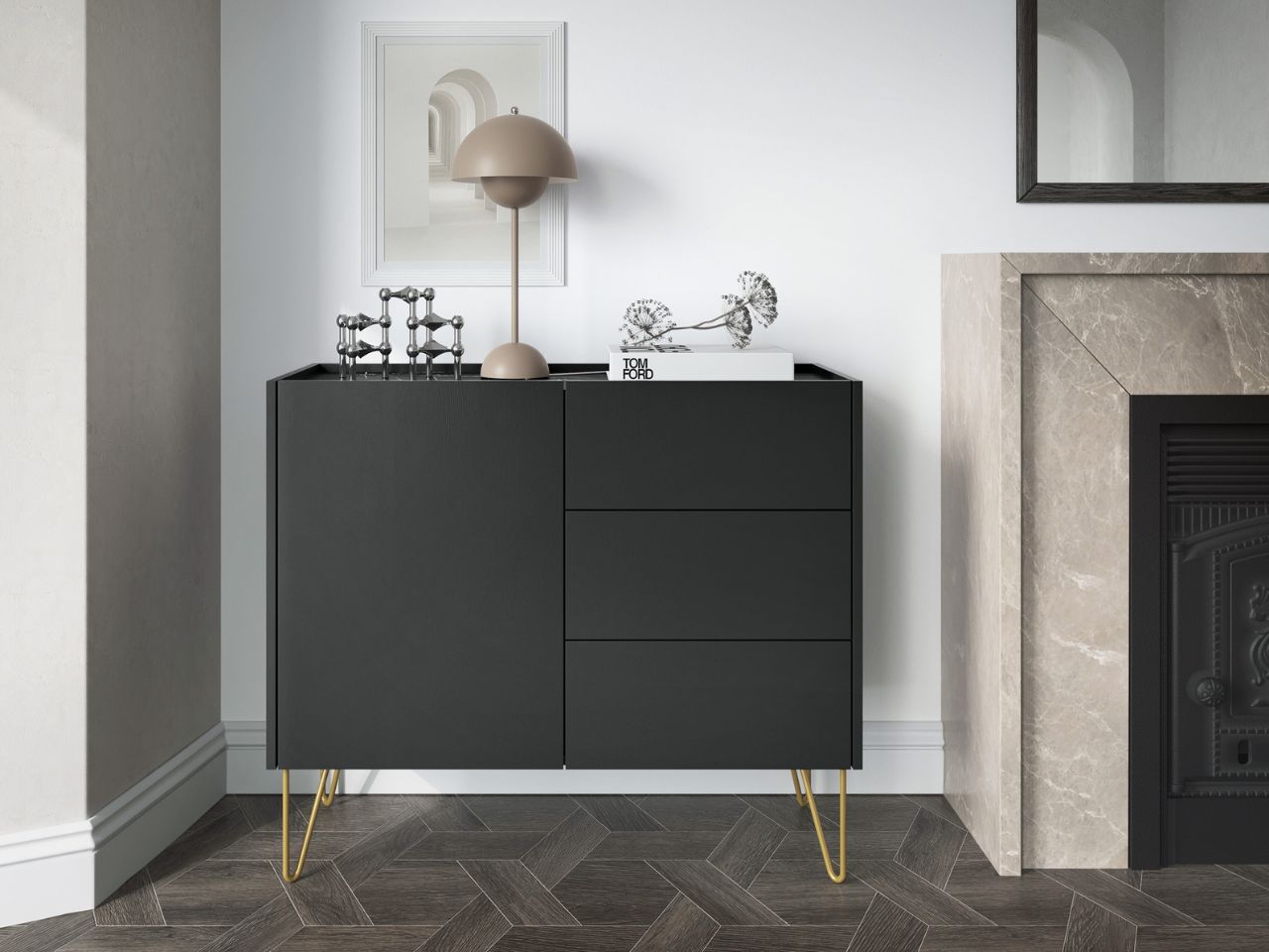 Komoda Darky z drzwiami i szufladami czarna na złotych nóżkach