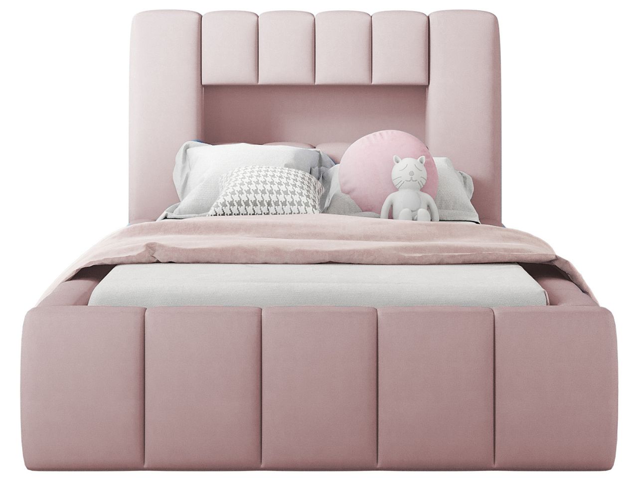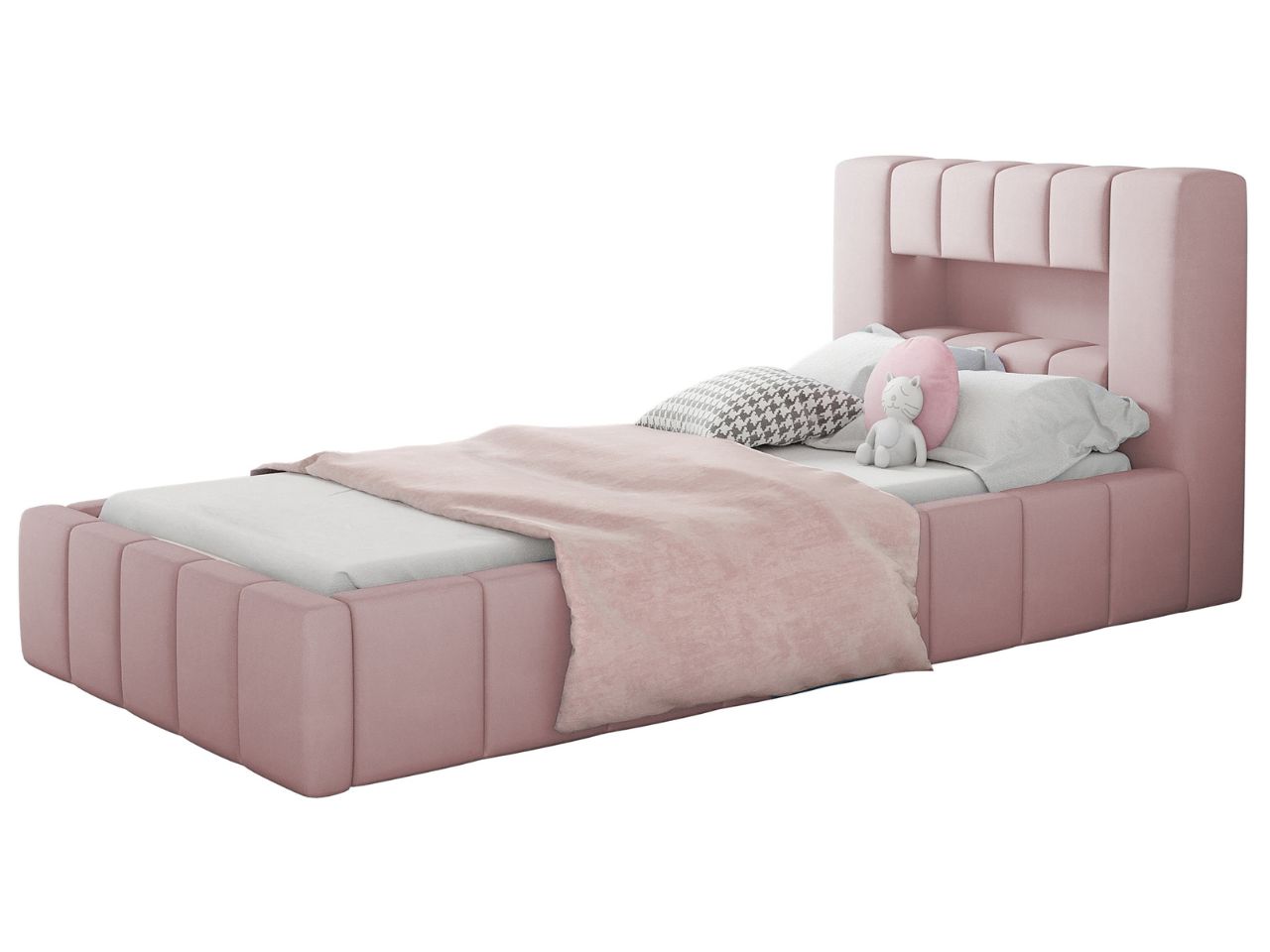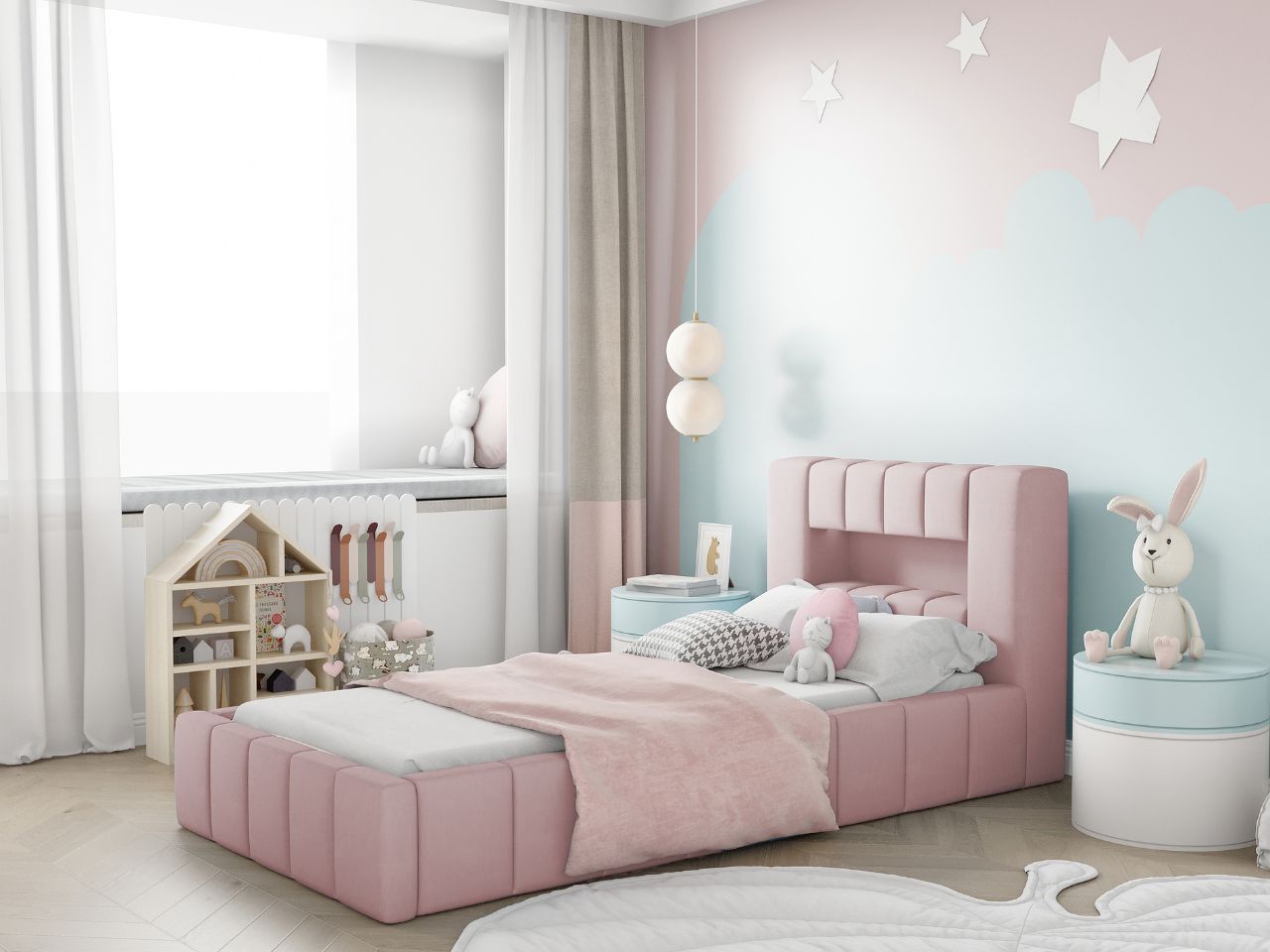 Łóżko zostało obite tkaniną ROYAL VELVET, która posiada pluszową, miękką powierzchnię, nadającą elegancki, a jednocześnie dziecięcy charakter. Dzięki subtelnemu połyskowi, tkanina odbija światło, tworząc efekt głębi i ciepła w pomieszczeniu. Materiał jest odporny na ścieranie i łatwy w utrzymaniu czystości, co czyni go idealnym wyborem do pokoju dziecięcego.