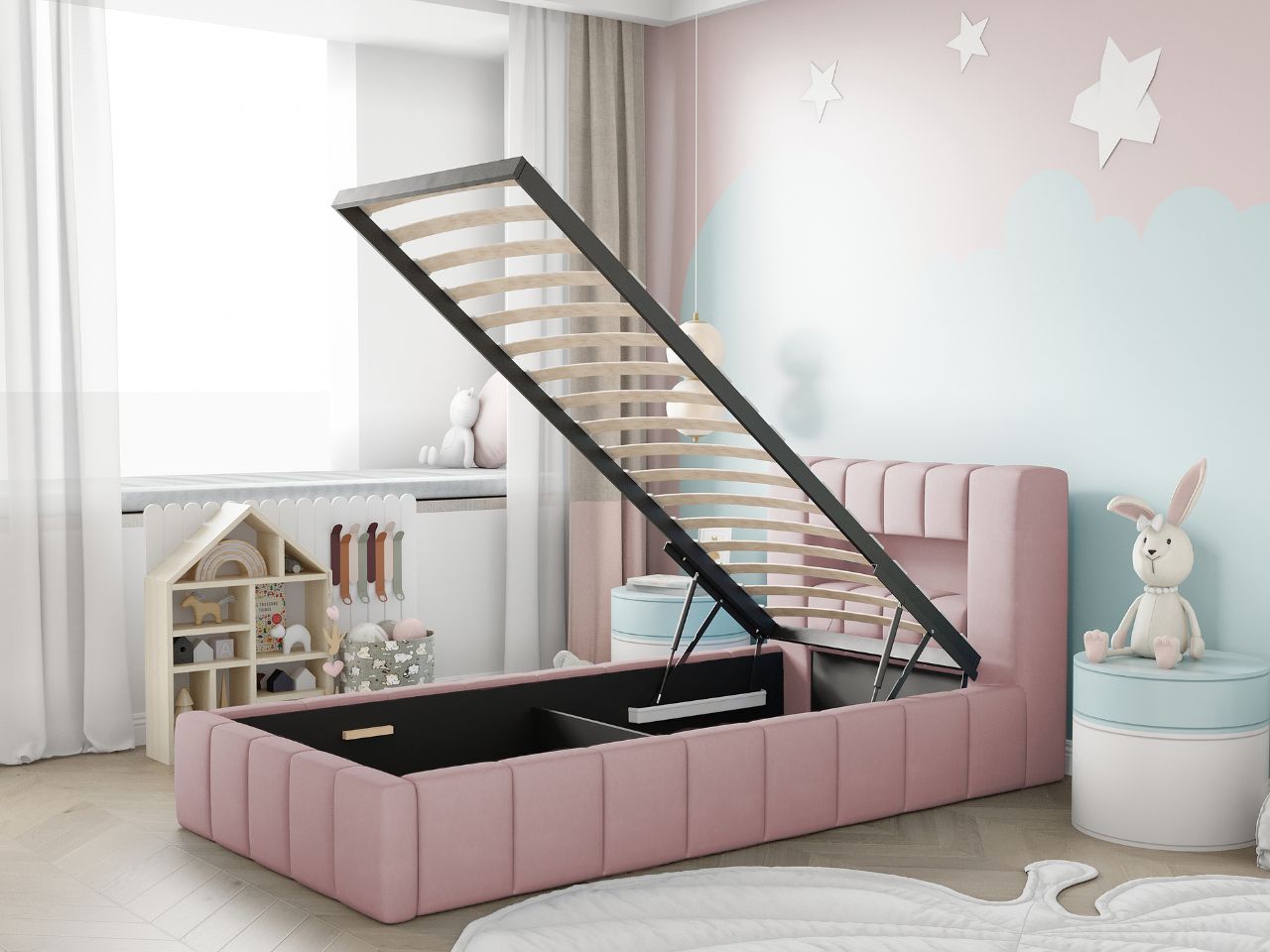 Pojemik wykonany z solidnej metalowej ramy i drewnianych listew, oferuje nie tylko wyjątkową stabilność, ale również praktyczne miejsce do przechowywania zabawek, pościeli i innych przedmiotów, dzięki przestrzeni pod stelażem. Siłowniki gazowe o dużej mocy sprawiają, że podnoszenie stelaża wraz z materacem staje się dziecinnie proste.