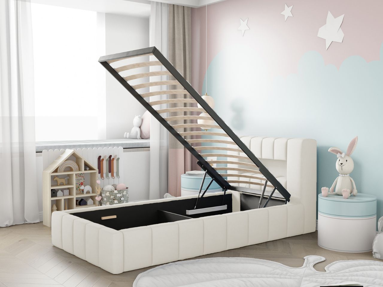 Pojemik wykonany z solidnej metalowej ramy i drewnianych listew, oferuje nie tylko wyjątkową stabilność, ale również praktyczne miejsce do przechowywania zabawek, pościeli i innych przedmiotów, dzięki przestrzeni pod stelażem. Siłowniki gazowe o dużej mocy sprawiają, że podnoszenie stelaża wraz z materacem staje się dziecinnie proste.