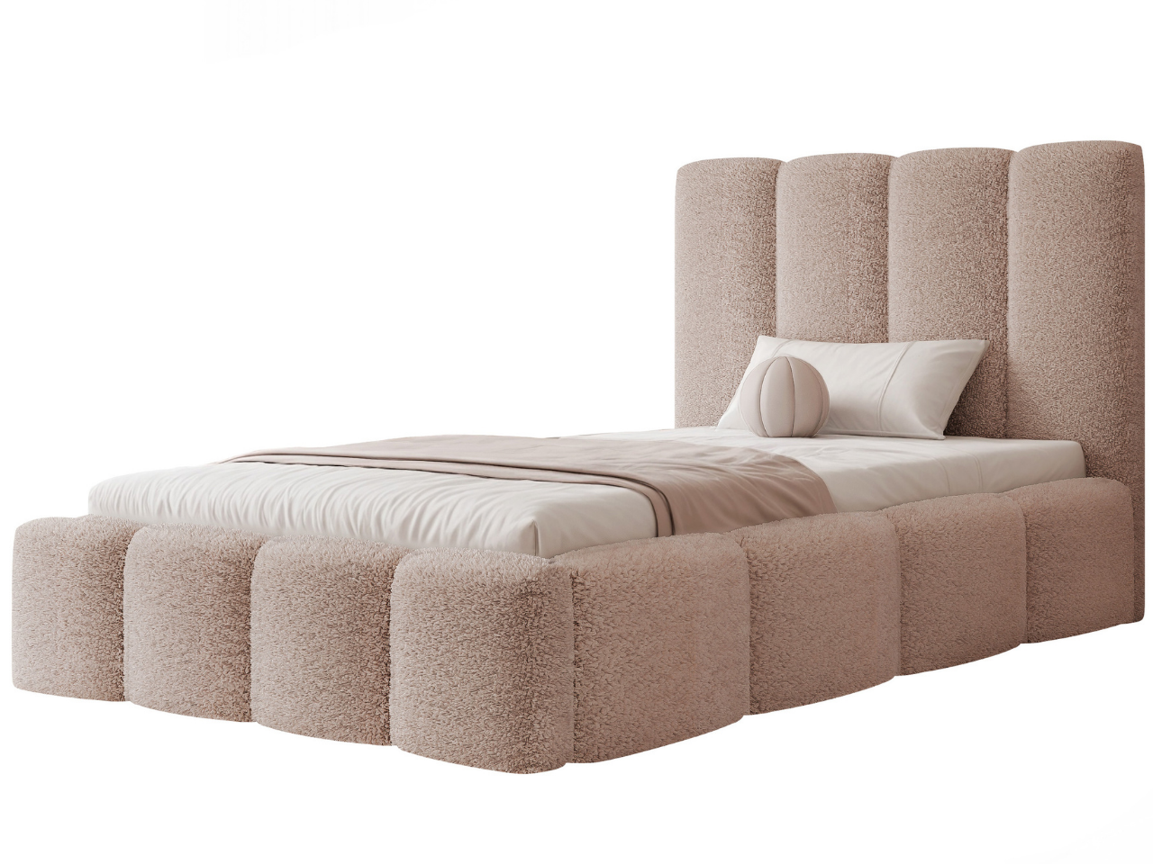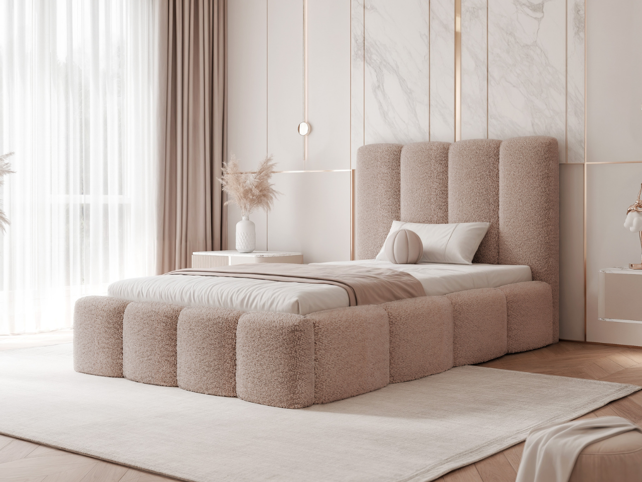 Łóżko zostało obite tkaniną Coral bouclé, która wyróżnia się przyjemną, miękką w dotyku strukturą o charakterystycznej pętelkowej fakturze. Materiał doskonale podkreśla nowoczesny styl łóżka tapicerowanego, nadając mu wyjątkowej przytulności i elegancji. Tkanina Coral to trwała tkanina, która świetnie prezentuje się na dużych powierzchniach i idealnie wpisuje się w aktualne trendy wnętrzarskie.