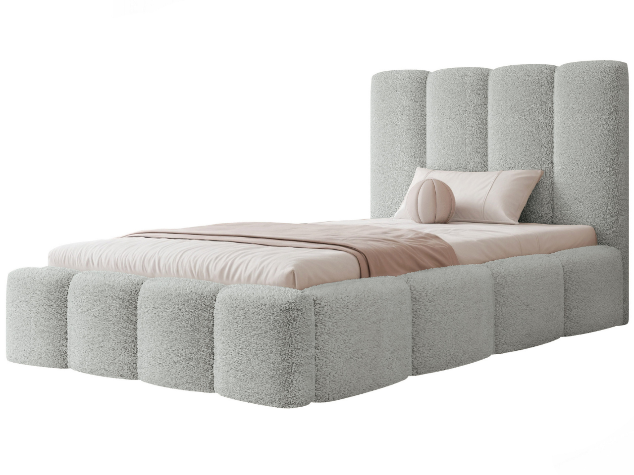 Łóżko zostało obite tkaniną Coral bouclé, która wyróżnia się przyjemną, miękką w dotyku strukturą o charakterystycznej pętelkowej fakturze. Materiał doskonale podkreśla nowoczesny styl łóżka tapicerowanego, nadając mu wyjątkowej przytulności i elegancji. Tkanina Coral to trwała tkanina, która świetnie prezentuje się na dużych powierzchniach i idealnie wpisuje się w aktualne trendy wnętrzarskie.
