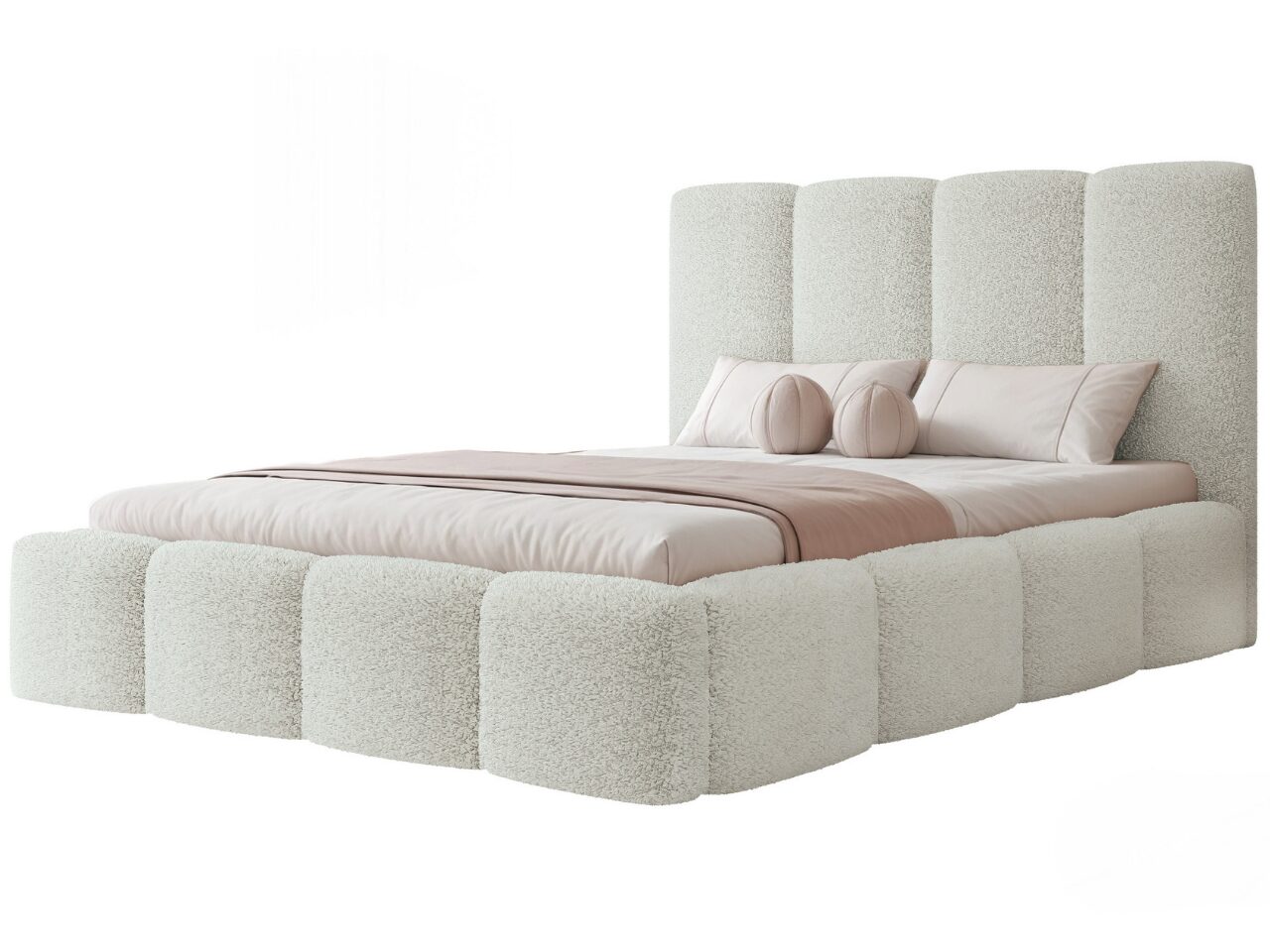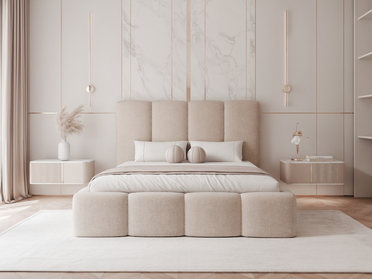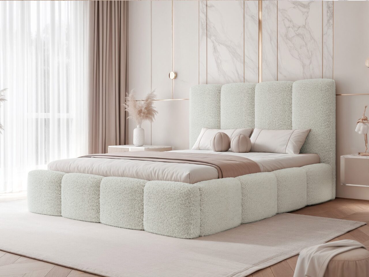 Łóżko zostało obite tkaniną Coral bouclé, która wyróżnia się przyjemną, miękką w dotyku strukturą o charakterystycznej pętelkowej fakturze. Materiał doskonale podkreśla nowoczesny styl łóżka tapicerowanego, nadając mu wyjątkowej przytulności i elegancji. Tkanina Coral to trwała tkanina, która świetnie prezentuje się na dużych powierzchniach i idealnie wpisuje się w aktualne trendy wnętrzarskie.