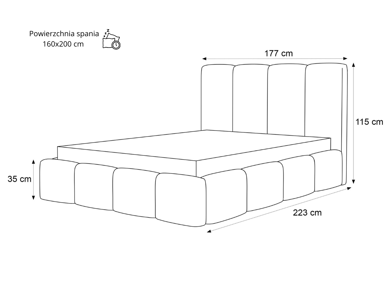 Charakterystycznym elementem łóżka są stylowe przeszycia  cztery pionowe pasy z przodu oraz na zagłówku tworzą eleganckie wciągi, które nadają bryle głębi i nowoczesnego wyglądu. Dodatkowe tapicerowanie po bokach sprawia, że łóżko prezentuje się estetycznie z każdej strony, dzięki czemu świetnie wygląda zarówno przy ścianie, jak i w centralnej części sypialni.