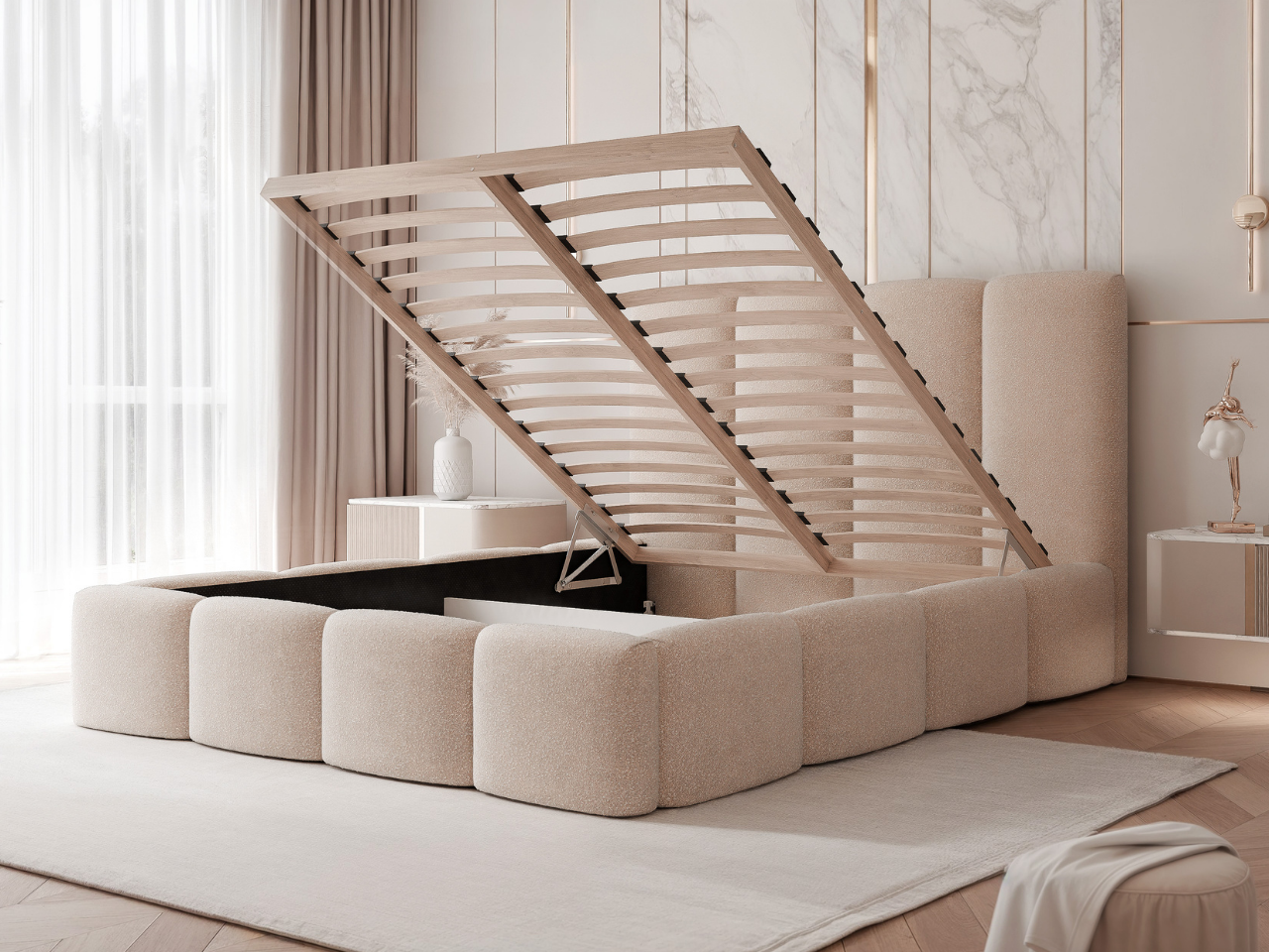 Solidny drewniany stelaż zapewnia trwałość i odpowiednie podparcie materaca, a duży pojemnik na pościel to praktyczne rozwiązanie, które pozwala maksymalnie wykorzystać przestrzeń. System podnoszenia ze wspomaganiem sprężynowym gwarantuje wygodny i lekki dostęp do schowka.