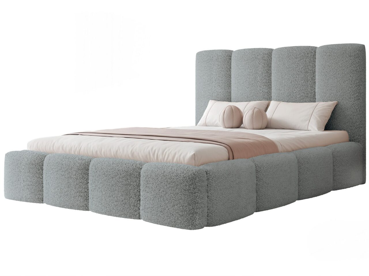 Łóżko zostało obite tkaniną Coral bouclé, która wyróżnia się przyjemną, miękką w dotyku strukturą o charakterystycznej pętelkowej fakturze. Materiał doskonale podkreśla nowoczesny styl łóżka tapicerowanego, nadając mu wyjątkowej przytulności i elegancji. Tkanina Coral to trwała tkanina, która świetnie prezentuje się na dużych powierzchniach i idealnie wpisuje się w aktualne trendy wnętrzarskie.
