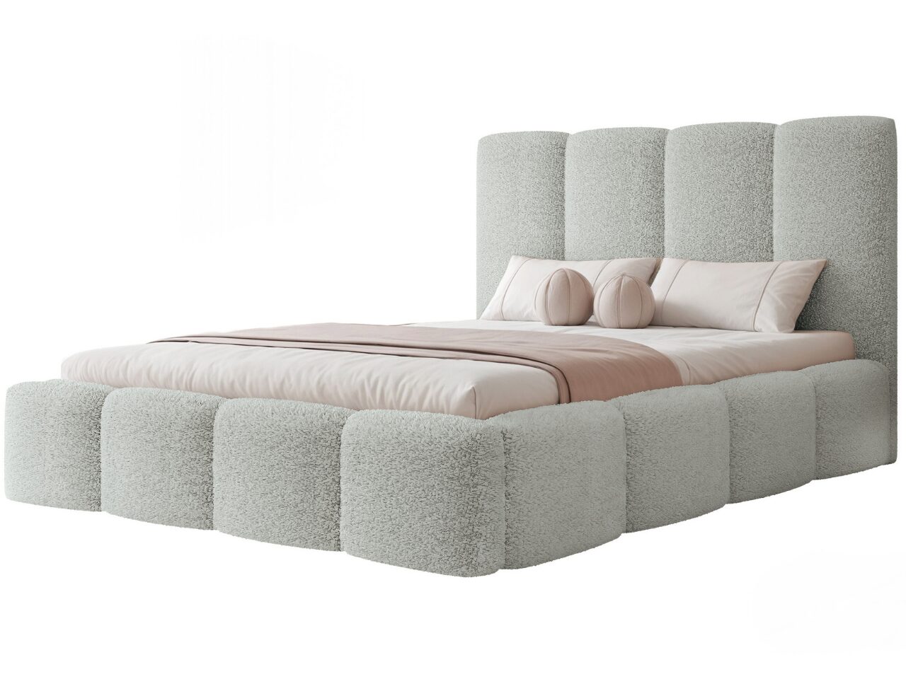 Łóżko zostało obite tkaniną Coral bouclé, która wyróżnia się przyjemną, miękką w dotyku strukturą o charakterystycznej pętelkowej fakturze. Materiał doskonale podkreśla nowoczesny styl łóżka tapicerowanego, nadając mu wyjątkowej przytulności i elegancji. Tkanina Coral to trwała tkanina, która świetnie prezentuje się na dużych powierzchniach i idealnie wpisuje się w aktualne trendy wnętrzarskie.