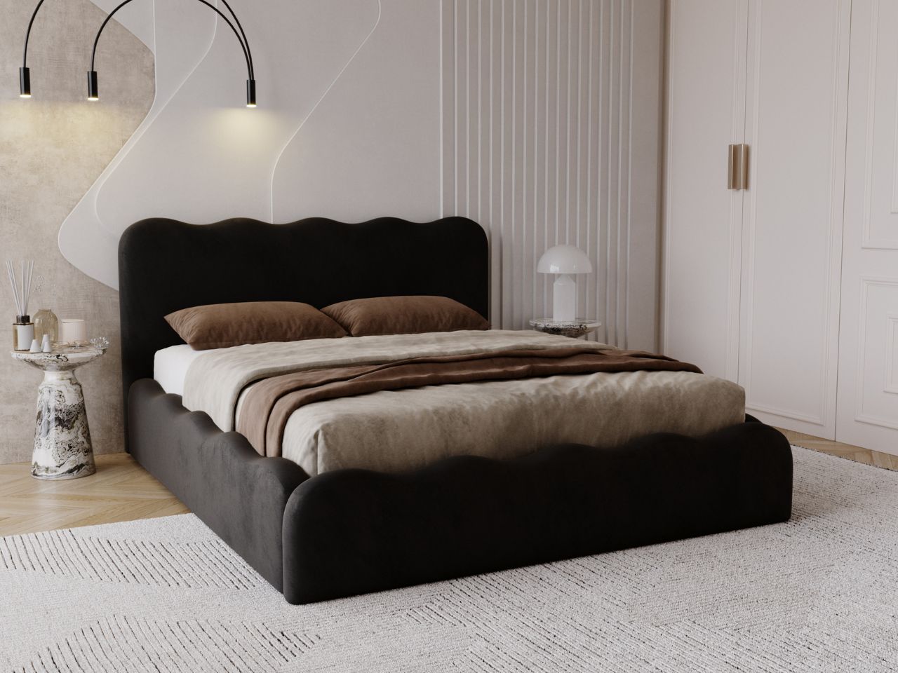 Nowoczesne Łóżko tapicerowane Boe 120×200 o wyjątkowym designie, które idealnie wpisuje się w trendy współczesnych wnętrz. Jego charakterystyczny, falowany zagłówek oraz boczne wykończenia dodają sypialni elegancji i subtelności, tworząc przytulny klimat.