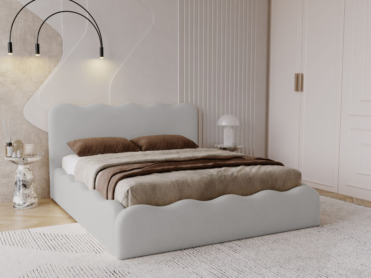 Nowoczesne Łóżko tapicerowane Boe 140×200 o wyjątkowym designie, które idealnie wpisuje się w trendy współczesnych wnętrz. Jego charakterystyczny, falowany zagłówek oraz boczne wykończenia dodają sypialni elegancji i subtelności, tworząc przytulny klimat.