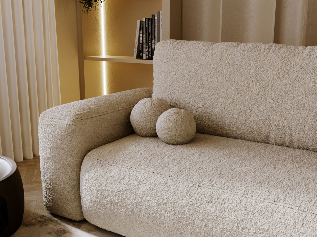 Tkanina Quelle to wysokiej jakości materiał obiciowy typu bouclé, określany również jako „baranek”. Wyróżnia się charakterystyczną, pętelkową strukturą, która nadaje jej puszystości i wyjątkowej miękkości. Dzięki swojej trójwymiarowej fakturze dodaje meblom przytulności, elegancji i niepowtarzalnego charakteru, jednocześnie wpisując się w najnowsze trendy wnętrzarskie.