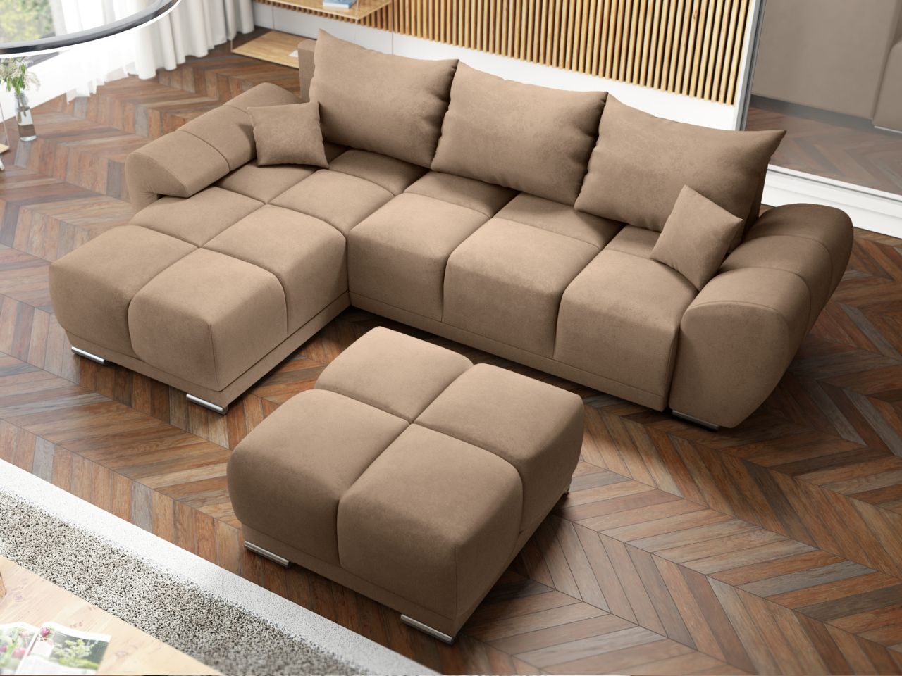 Wysokość pufy Belli została starannie dobrana, aby idealnie komponowała się z innymi meblami z kolekcji, takimi jak narożniki czy fotele, umożliwiając stworzenie spójnej i funkcjonalnej aranżacji salonu.