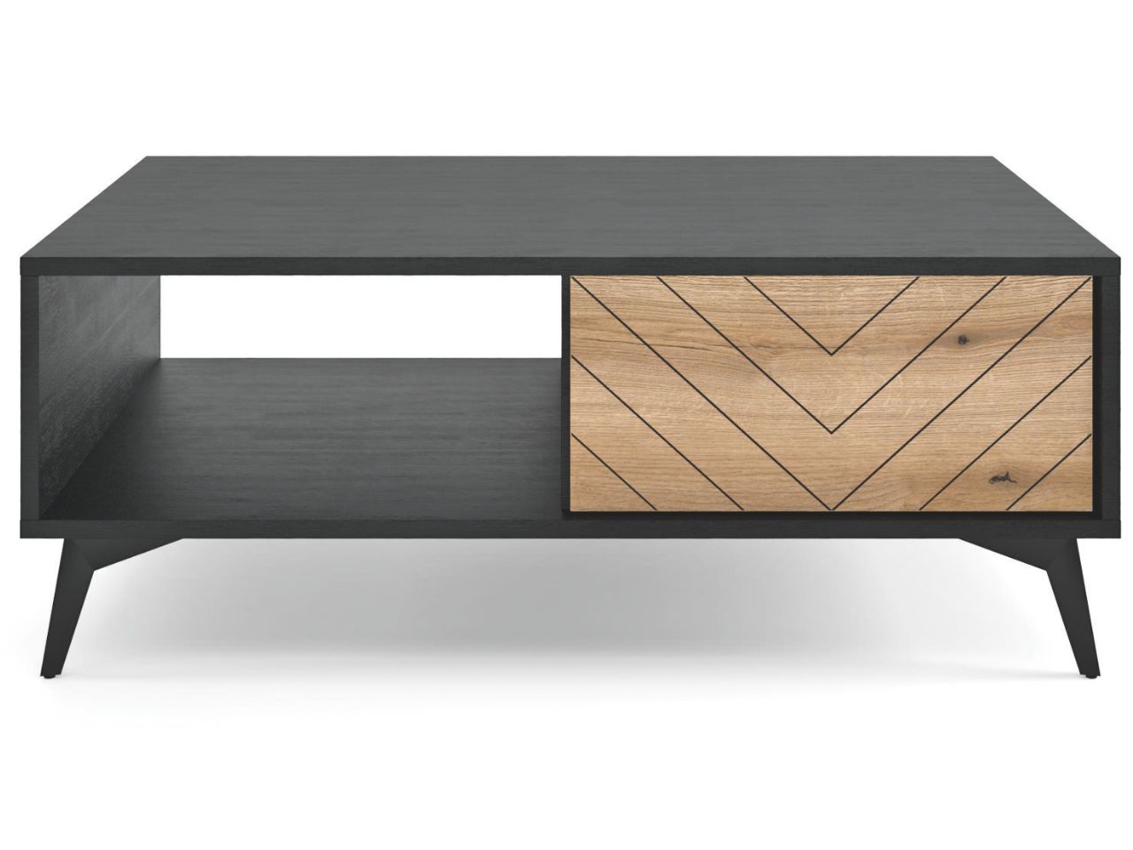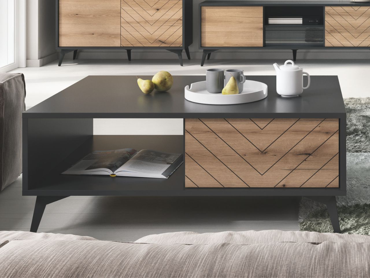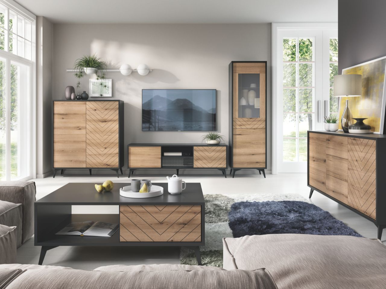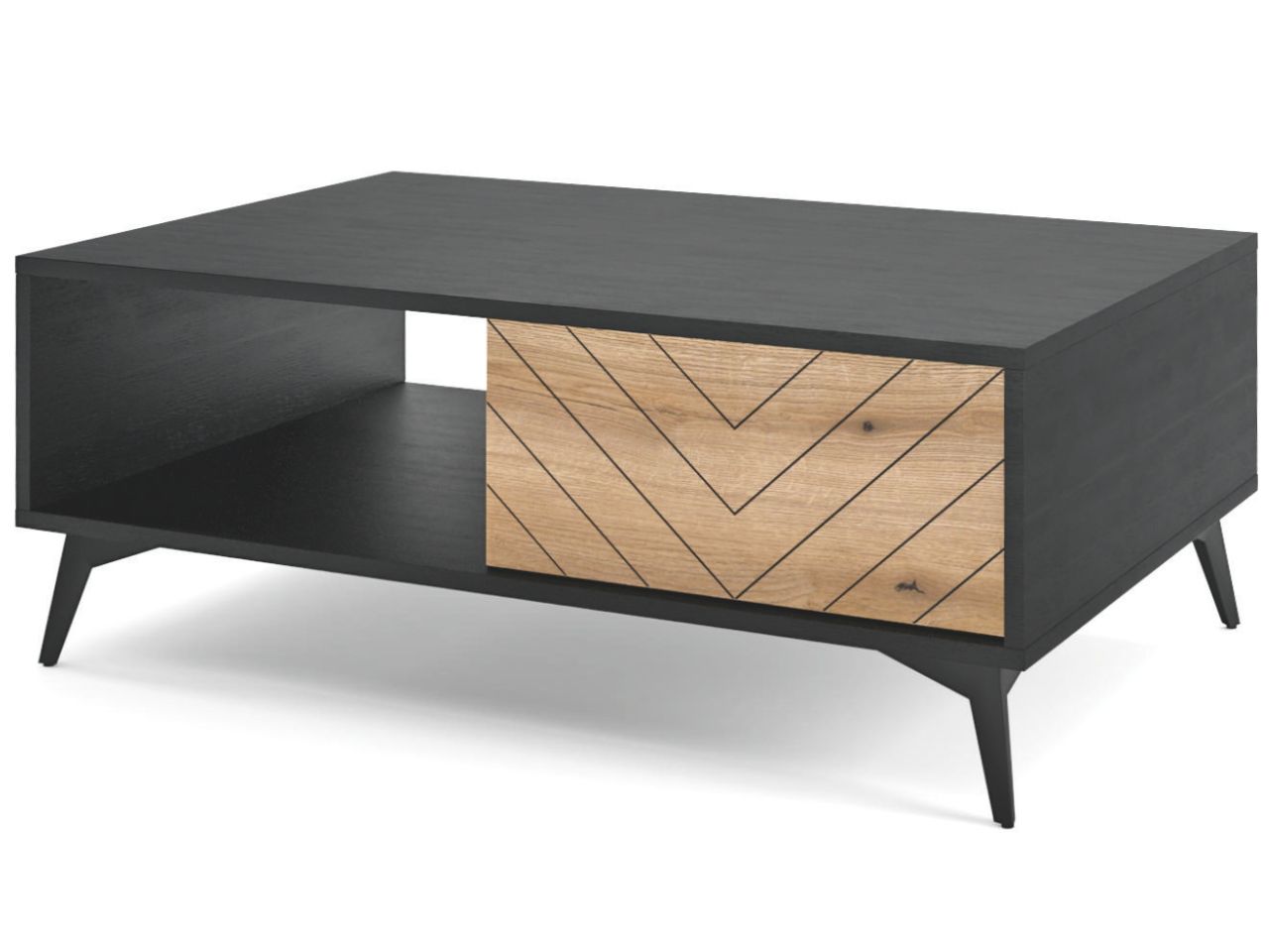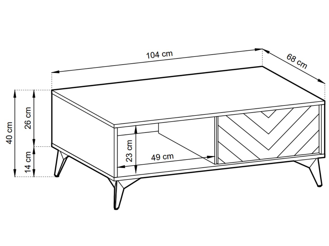 Charakterystyczny dekor jodełki na frontach szuflad nadaje stolikowi unikalny, nowoczesny wygląd, który wyróżnia go na tle innych mebli.