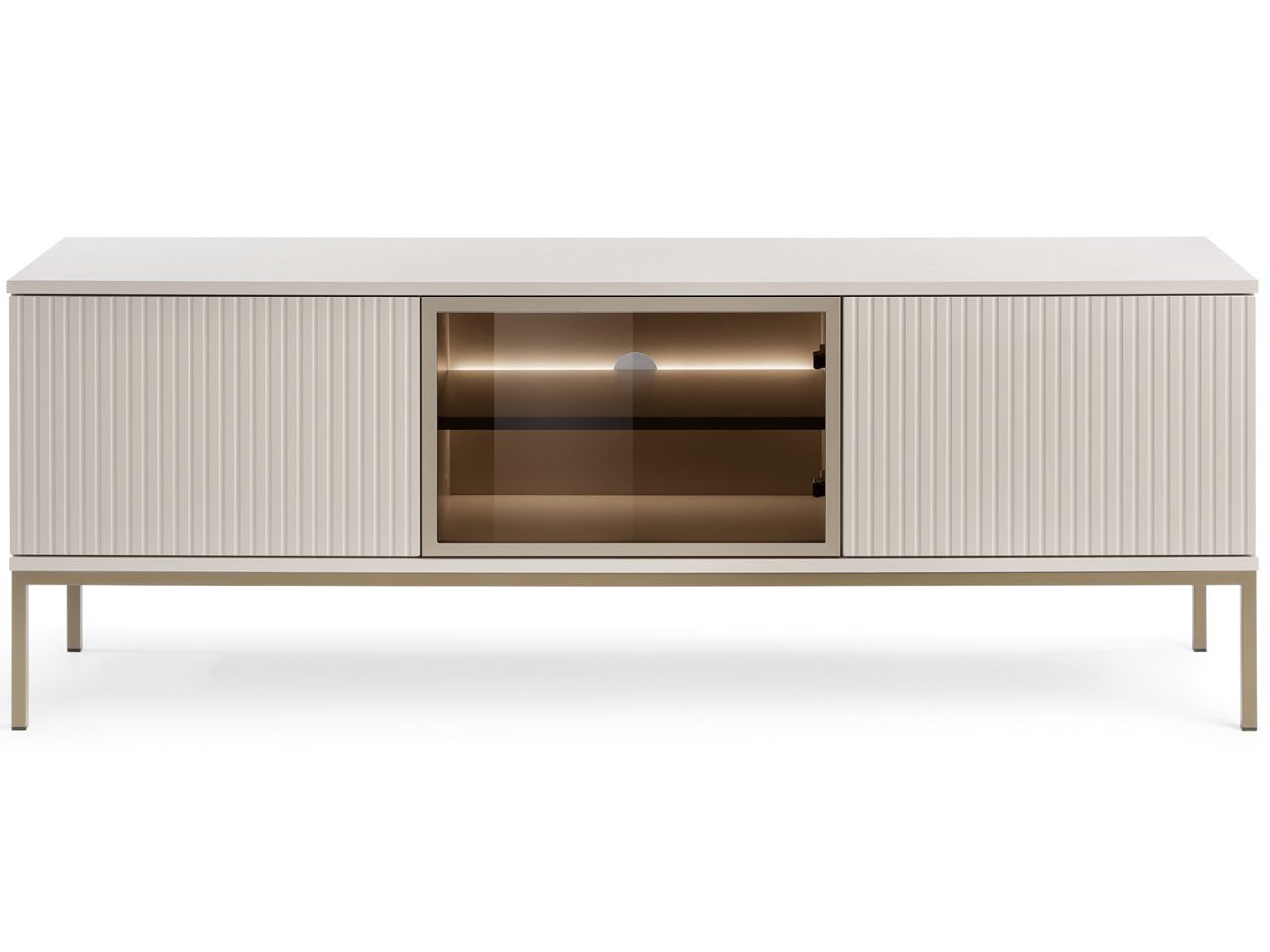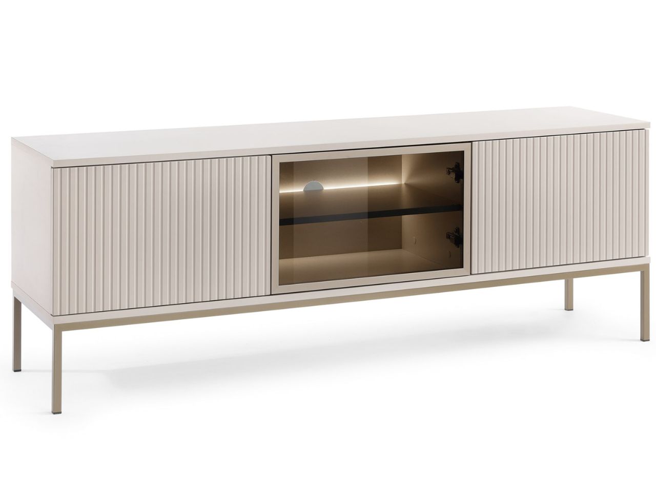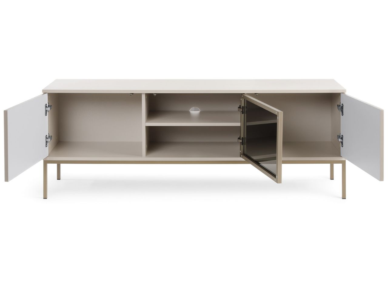 Szafka RTV LAMI w kolorze kaszmir to nowość, która stanowi doskonały wybór dla osób ceniących elegancki design i praktyczne rozwiązania. Nowoczesna konstrukcja z 3 zamykanymi frontami pozwala na przechowywanie niezbędnych akcesoriów RTV, zapewniając porządek w salonie. Jeden ze szklanych frontów dodaje całości lekkości i nowoczesnego charakteru.