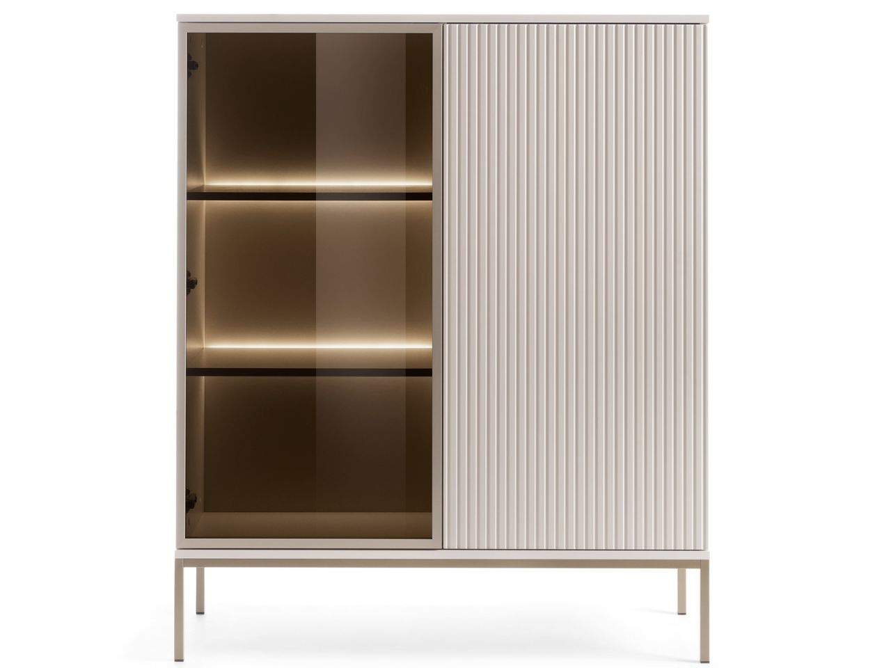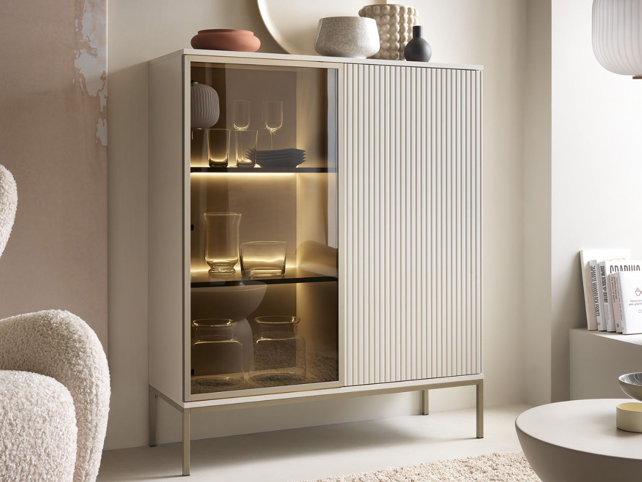 Witryna LAMI w kolorze kaszmir to nie tylko mebel, ale także element, który stanie się centralnym punktem Twojego wnętrza.